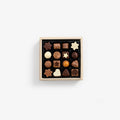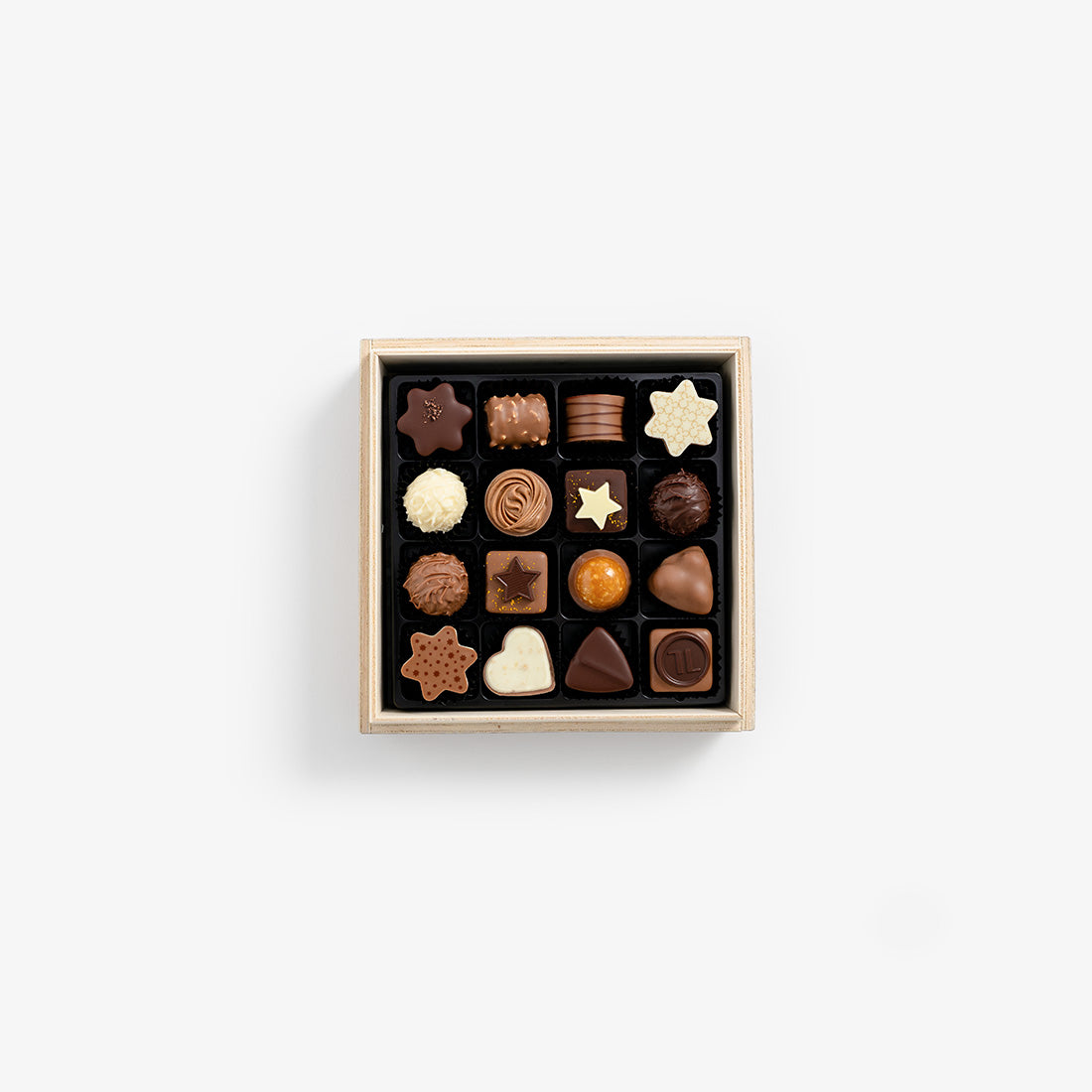 Delicious variety of pralines and truffles in a holiday-themed wood box.
