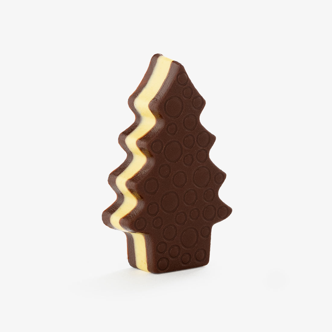 Christmas tree made of dark chocolate filled with fruity white orange flavored chocolate.