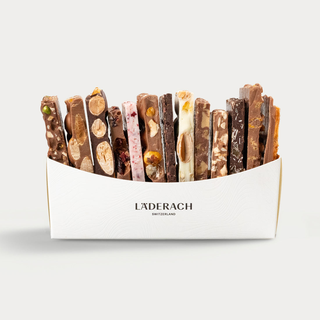 Set sail on a voyage of pure chocolate bliss with the FrischSchoggi boat. It’s not just chocolate; it’s a luxurious escape in every bite. The Läderach FrischSchoggi classic - a perfect gift. From fruity and fresh with white chocolate and raspberry pieces, classic with milk chocolate and caramelised Piedmontese hazelnuts or pure enjoyment with dark chocolate - there is something for everyone here. Our Läderach FrischSchoggi is made with love and only the best and freshest ingredients in Switzerland. Enjoy the chocolate as fresh as possible within 2-3 weeks. (650g)