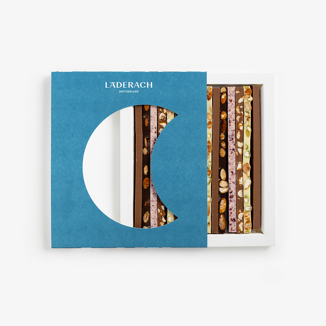 Waterjet-cut FrischSchoggi sticks of our most popular varieties.