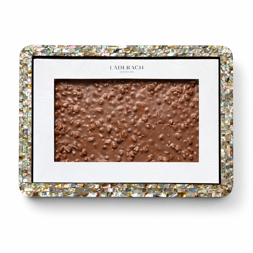 One of our limited edition Ramadan FrischSchoggi flavors - fine date pieces and caramelized broken almonds in Swiss milk chocolate.